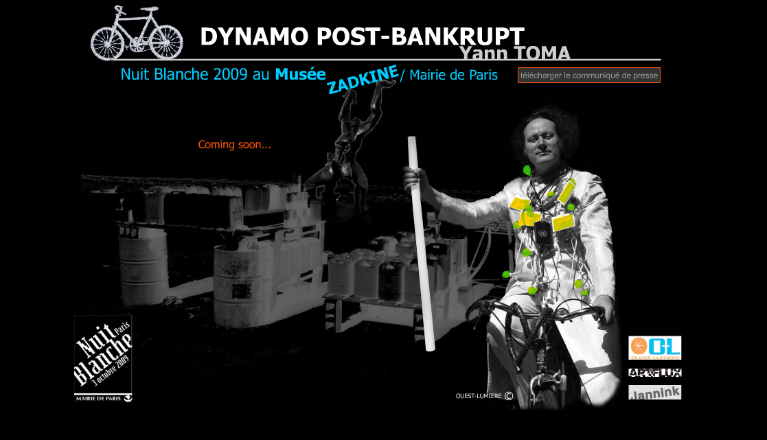 Yann Toma, President for life of Ouest-Lumière, a fictional company producing and distributing artistic energy, is setting up an agency at the Zadkine Museum for one night. Ouest-Lumière intends to respond to the current shortage of light with federative and radical devices, inviting visitors to pedal until they are thirsty, and to become the actors and driving forces of an unprecedented lighting device. West - Light agents will operate permanently to ensure the essential link to the physical and jubilant engagement of the spectators. The participants will live a unique experience, individual and collective: being one with their dynamos, muscular and nervous endings connected to cables and light vectors, the synergy of the circulatory flows will animate the Zadkine museum as never before. The museum becomes one of the branches of Ouest - Lumière, for one night, joining the vast cartographic, energetic and artistic network of the utopian and archipelic world drawn by Yann Toma for more than eighteen years. As an extension of this electric night, and as a way of following the global reflection of the President for life of Ouest-Lumière, the booklet-poster Dynamo Post-Bankrupt, published by Jannink in 1000 copies, will be distributed to the participants of the device. Texts : François Noudelmann, Sylvain Lecombre, Yann Toma, and photographs by the artist.